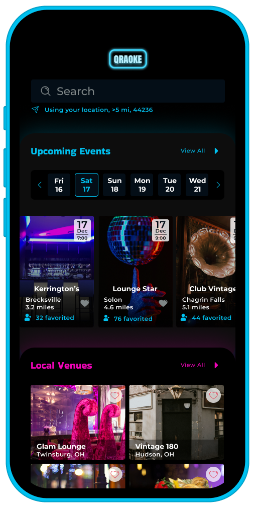 The goal is to create an all-encompassing mobile application that links users to local karaoke events. This platform will also enable DJs to showcase their music collections and accept song requests, ultimately enriching the karaoke experience for both participants and performers alike. Through this innovative approach, we aim to foster a more interactive and enjoyable atmosphere for all users.