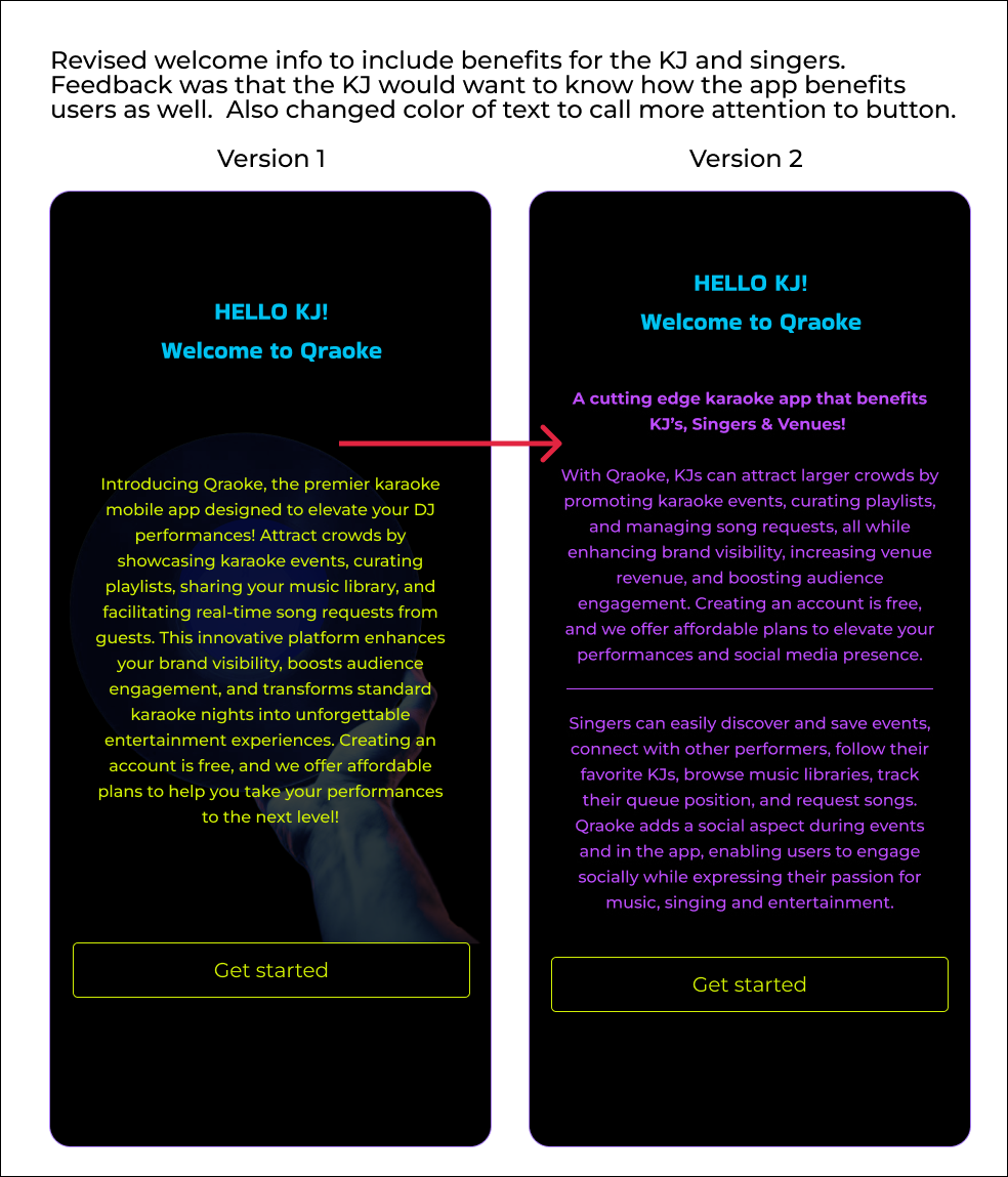 The updated introductory text now includes benefits of the app for both KJs and singers. Even further testing showed that KJs also want to know the benefits the app offers to businesses.